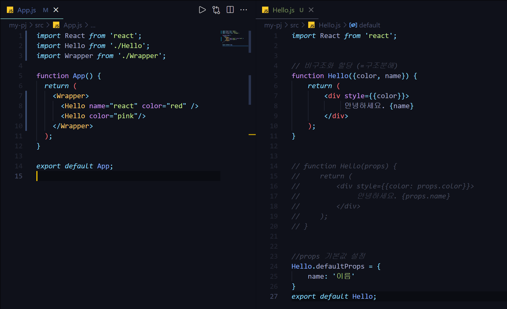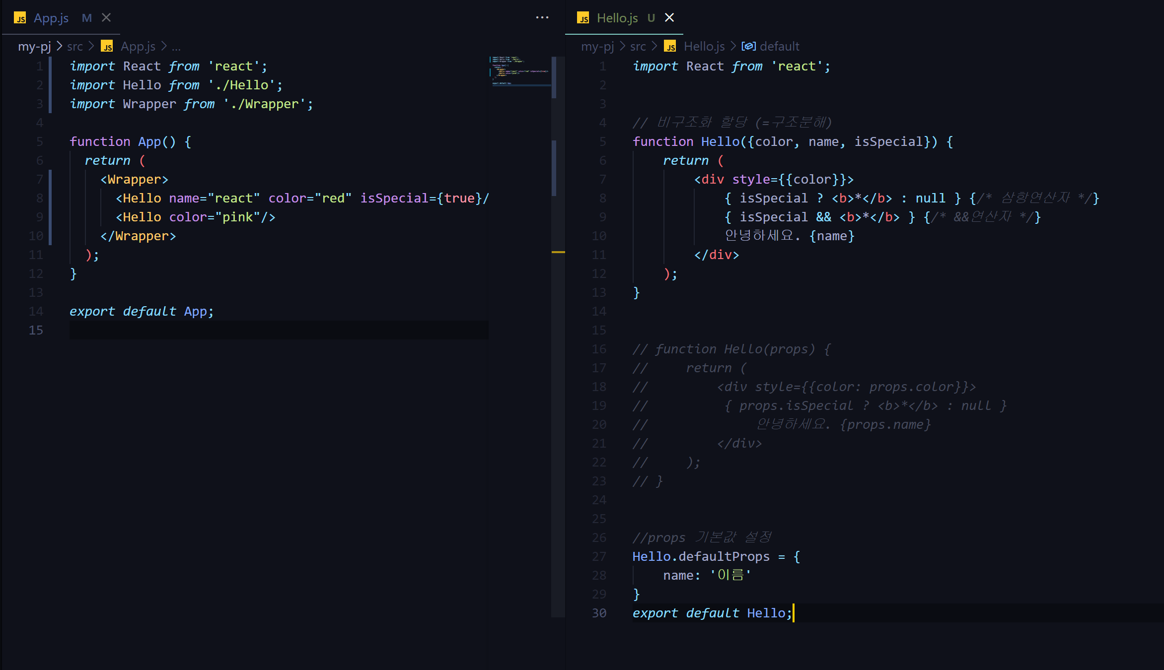 (defaultProps. 컴포넌트에 props를 지정하지 않았을 경우, 기본적으로 사용할 값을 정할 수 있다. )