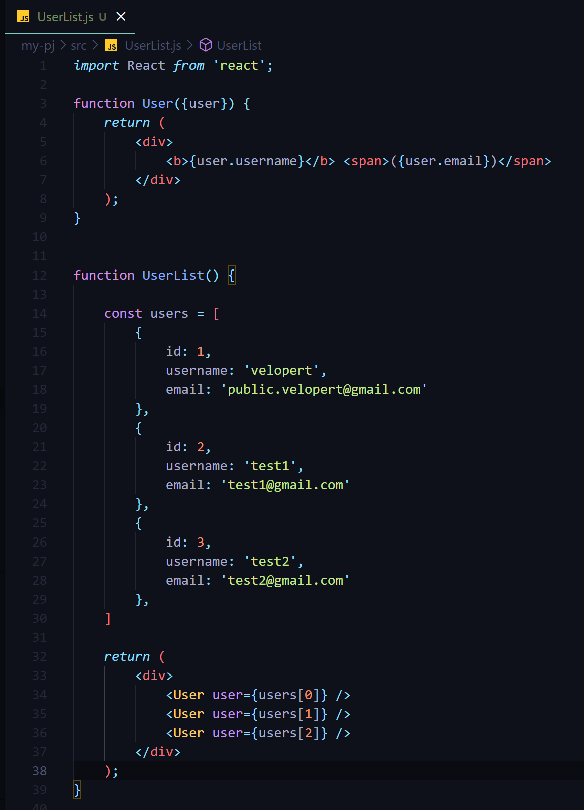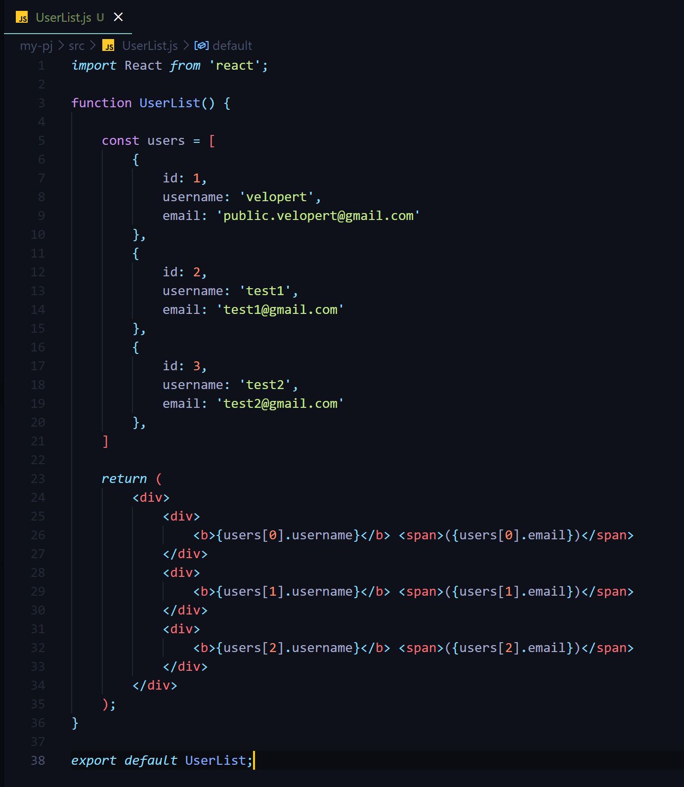 아래와 같이 코드 그대로 길게 작성하는 방법은 react의 컴포넌트 기능을 이용하지 못한 비효율적인 방법이다.