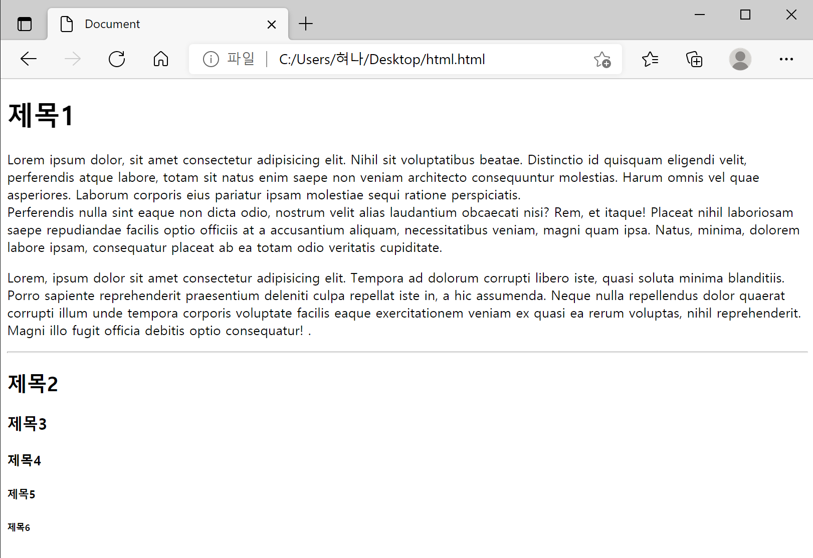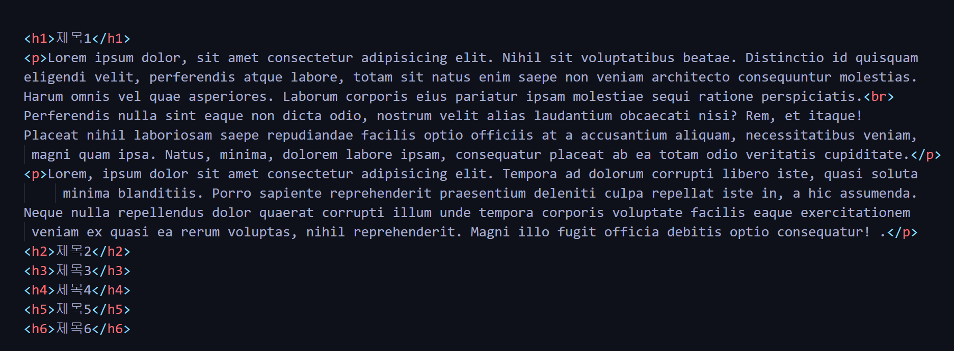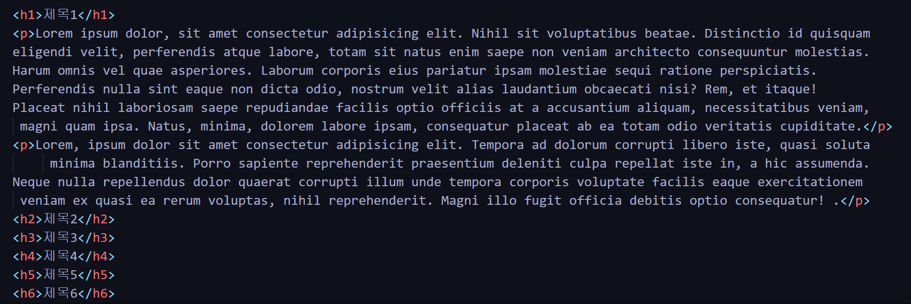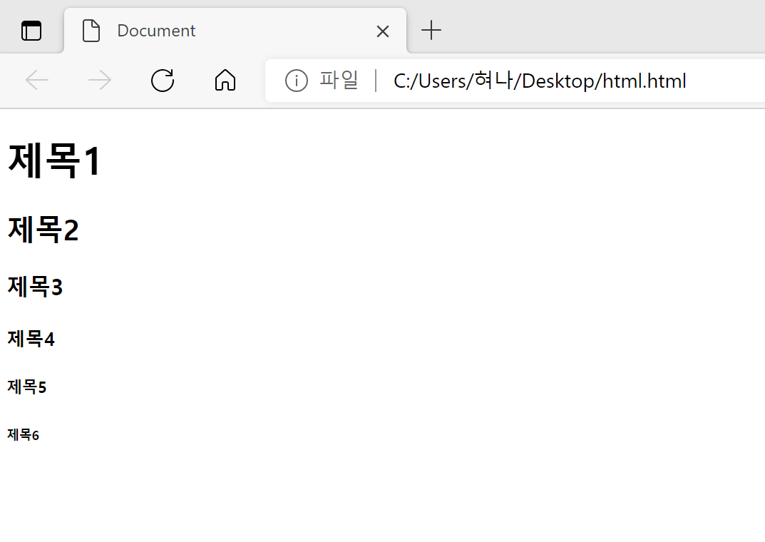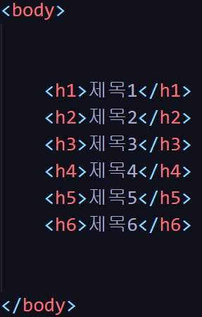 <h1>부터 <h6>까지 6종류가 있으며 숫자가 커질수록 작은 제목이다.