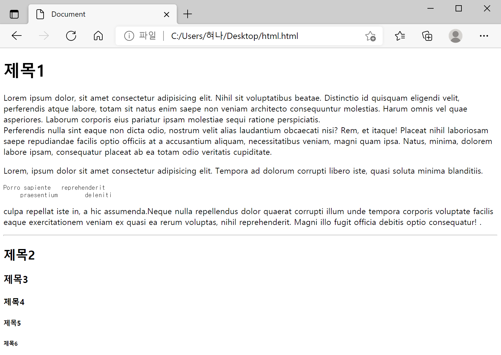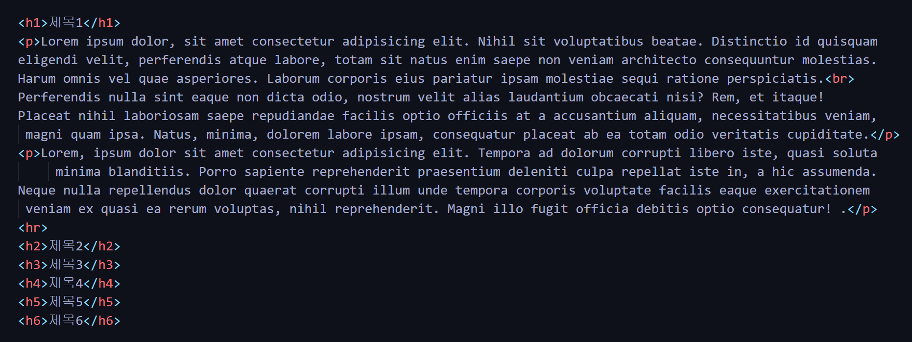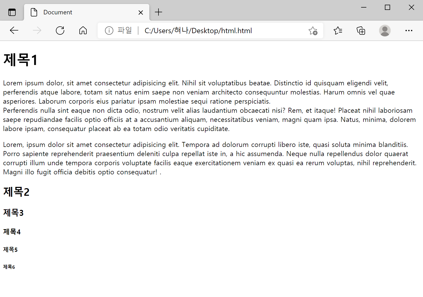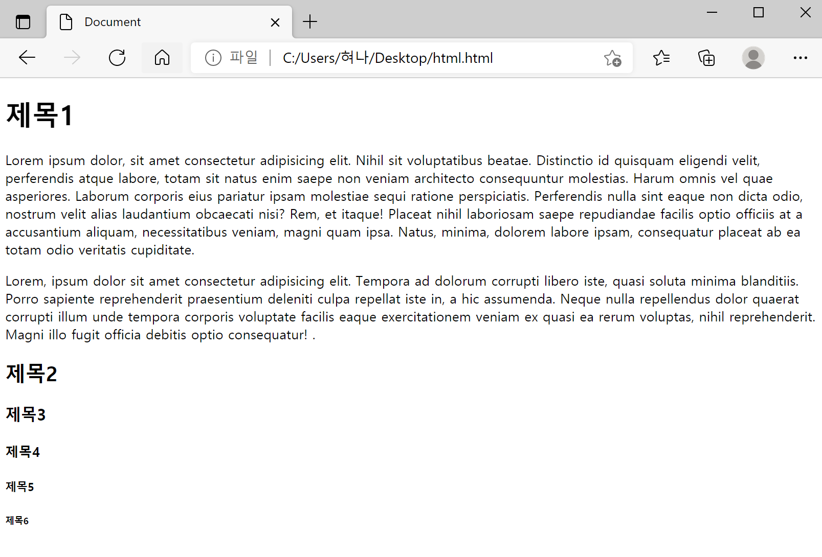 <h1>부터 <h6>까지 6종류가 있으며 숫자가 커질수록 작은 제목이다.