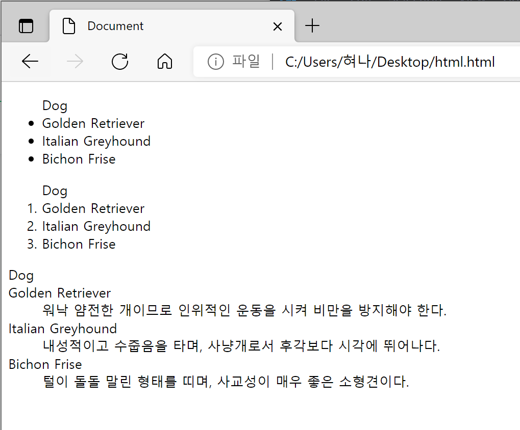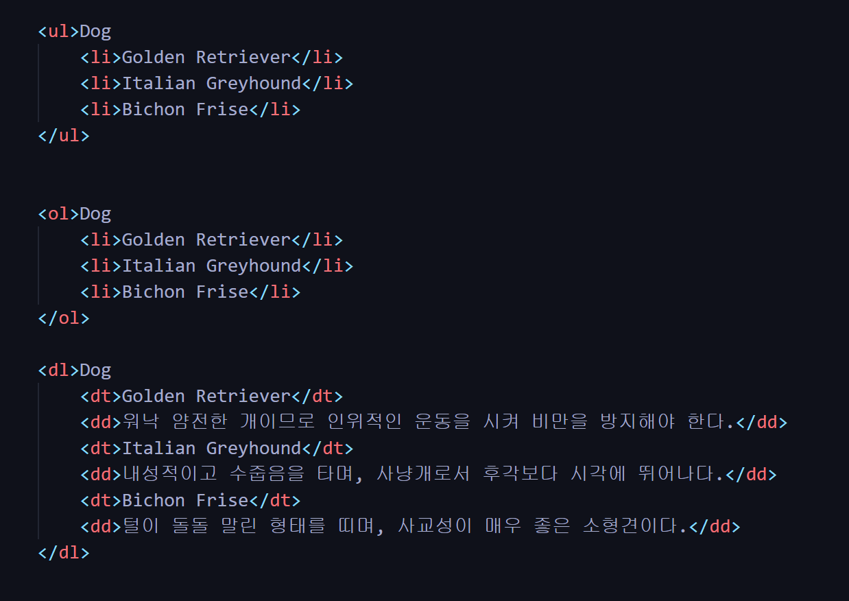 <dl> 태그를 사용하여 용어와 그에 대한 정의를 리스트로 작성할 수 있다.