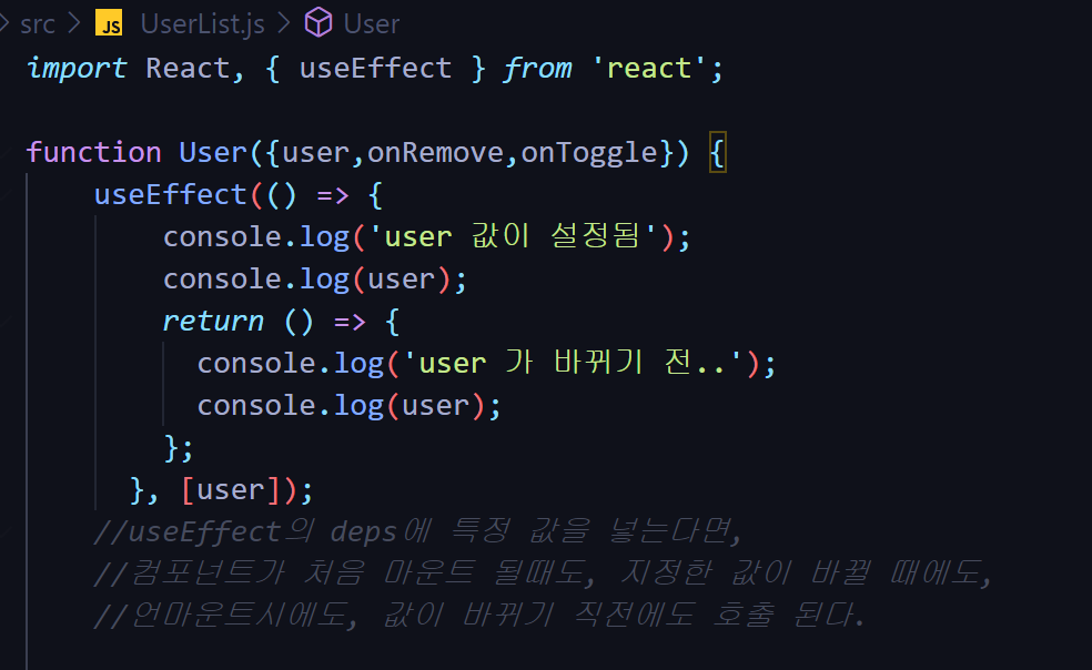 useEffect의 첫번째 파라미터 = 함수 / 두번째 파라미터 = 의존값